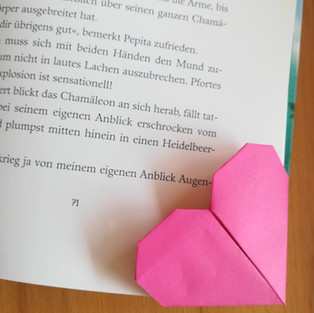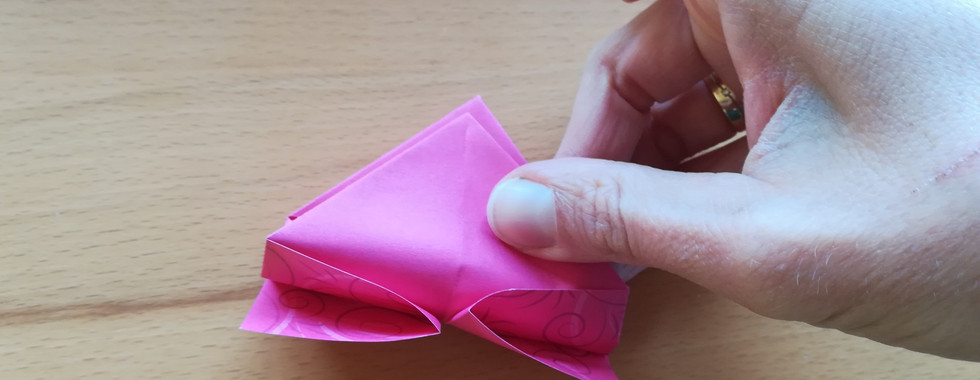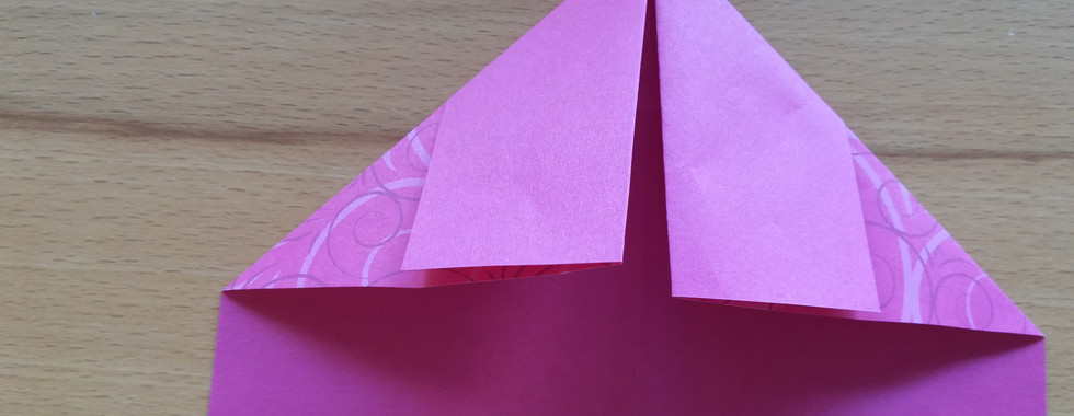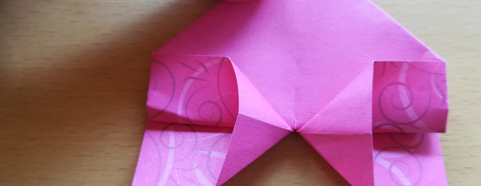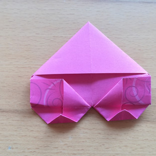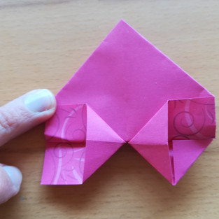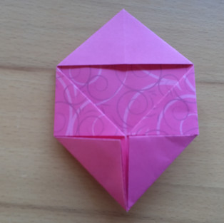 Nun faltest du die beiden Spitzen auch wieder nach oben. Drehe das Herz einmal um.